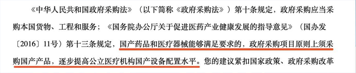 《國務(wù)院辦公廳關(guān)于促進(jìn)醫(yī)藥產(chǎn)業(yè)健康發(fā)展的指導(dǎo)意見》中規(guī)定,國產(chǎn)藥品和醫(yī)療器械能夠滿足要求的,政府采購項目原則上須采購國產(chǎn)產(chǎn)品。